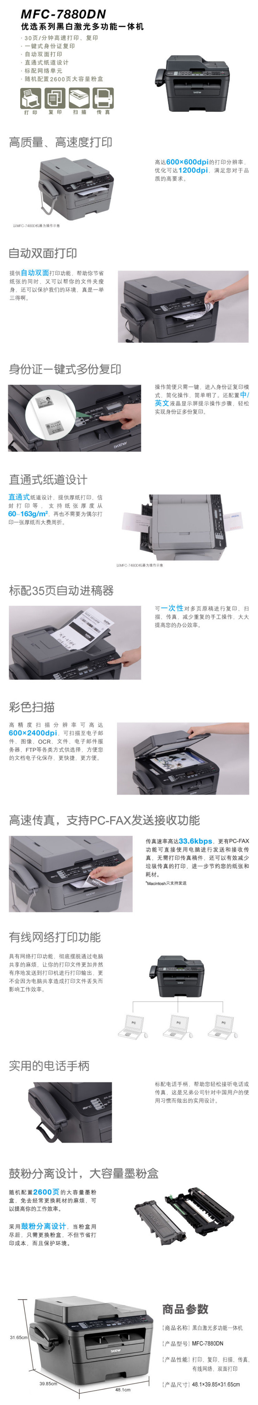 - 商品名稱(chēng):兄弟(Brother)MFC-7880DN A4黑白激光多功能一體機(jī)(600×600dpi) (打印/復(fù)印/掃描/傳真) 自動(dòng)雙面/支持有線網(wǎng)絡(luò)打印 30頁(yè)/分鐘 一年保修 適用耗材:DR-2350/TN-2312/TN-2325 鼓粉分離
