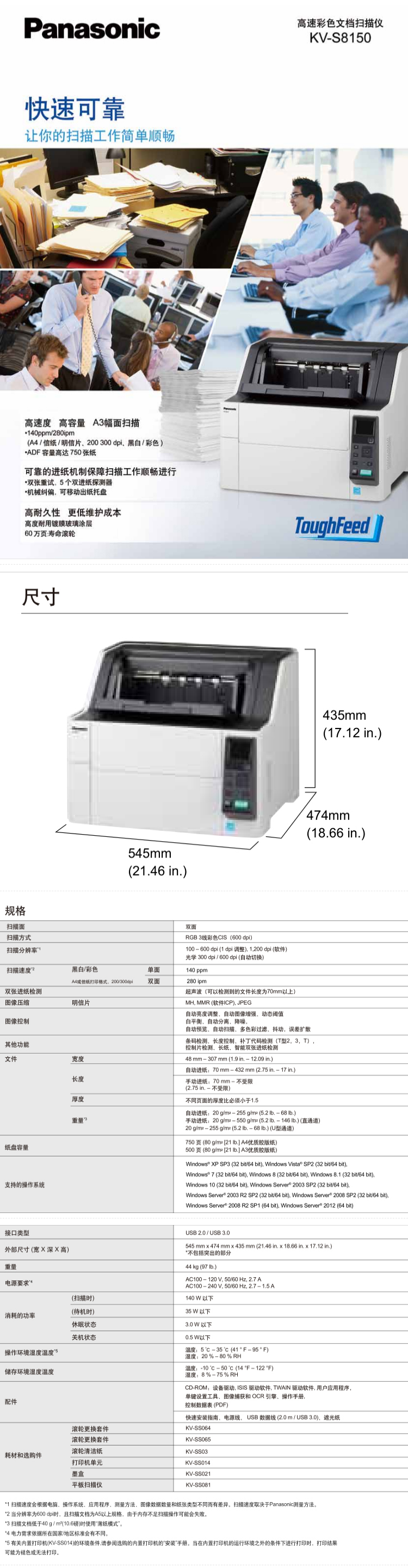 - 商品名稱:松下(Panasonic)KV-S8150高速掃描儀A3幅面/雙面/彩色 文檔/分辨率100-600dpi/黑白:140ppm/280ipm;彩色:140ppm/280ipm/饋紙式 可外接平板/保修一年