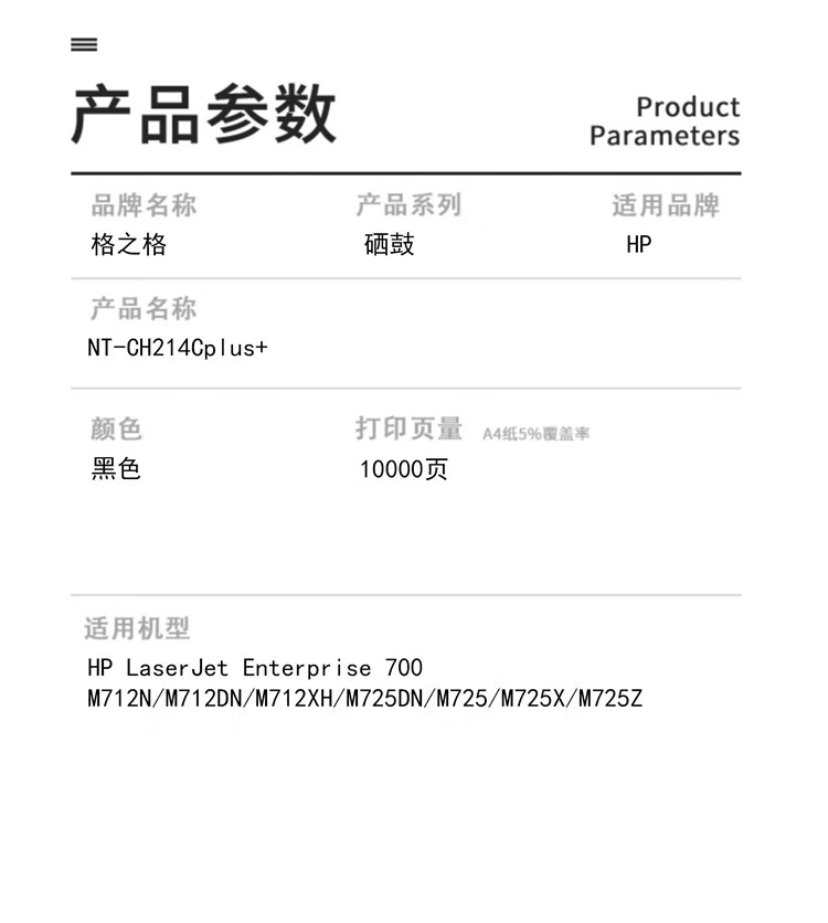 • 商品名稱:格之格 NT-CH214Cplus+ 黑色硒鼓10000頁印量 適用于HP LaserJet Enterprise 700 M712N/M712DN/M712XH/M725DN/M725/M725X/M725Z