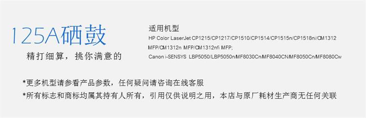 • 適用機(jī)型:適用于HP Color LaserJet CP1215/CP1217/CP1510/CP1514/CP1515n/CP1518ni/CM1312 MFP/CM1312n MFP/CM1312nfi MFP; Canon i-SENSYS LBP5050/LBP5050n/MF8030Cn/MF8040CN/MF8050Cn/MF808