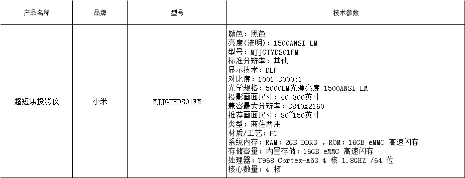 • 商品名稱:小米(MI) 投影儀 詳情見附件清單