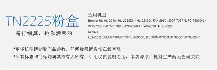 • 適用機型:Brother HL-HL-2240 / HL-2250DN / HL-2240D / FAX-2990 / DCP-7057 / MFC-7860DN / MFC-7360 / MFC-7470D / DCP-7060D / FAX-2890 / MFC-7290/Lenovo LJ2400/2400L/M7400/M7450F/LJ2600D/LJ2650DN/M7600D/M7650DF/M7650DNF