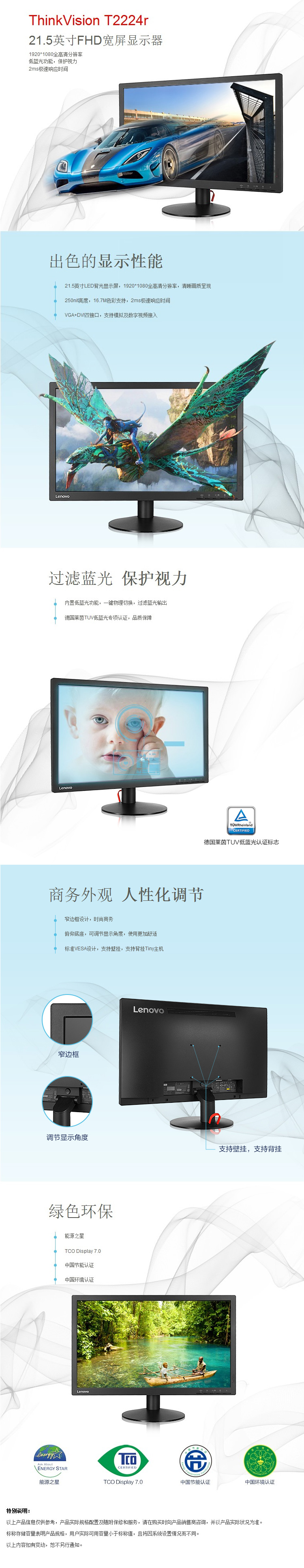 • 商品名稱:聯(lián)想(Lenovo)T2224rF 液晶顯示器 21.5英寸 1920*1080