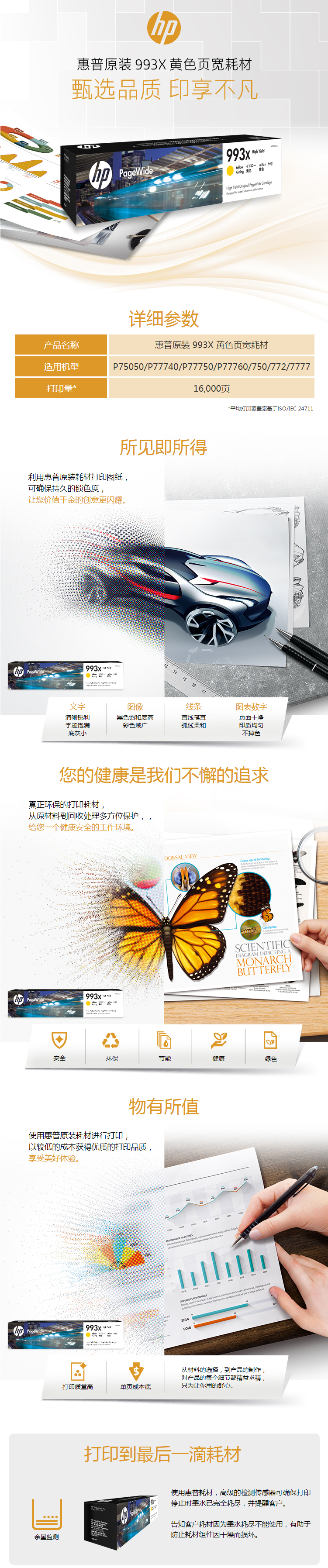 • 商品名稱:惠普(HP) 頁寬打印機(jī)墨盒 993X黃色大容量頁寬打印機(jī)墨盒M0K00AA 16000頁 適用于HP PageWide Pro 750系列(750dn/750dw); HP PageWide MFP 772系列(772dn/772dw/772zt); HP PageWide Pro MFP 777系列(777hc/777z)