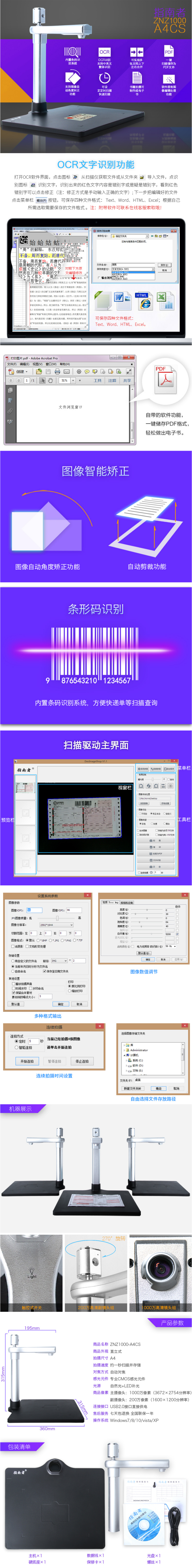 - 商品名稱:指南者 ZNZ1000-A4高拍儀掃描儀 拍攝尺寸A4、1000萬像素?cái)z像頭、USB2.0接口直接供電、OCR文字識(shí)別功能、圖像智能矯正、條形碼識(shí)別