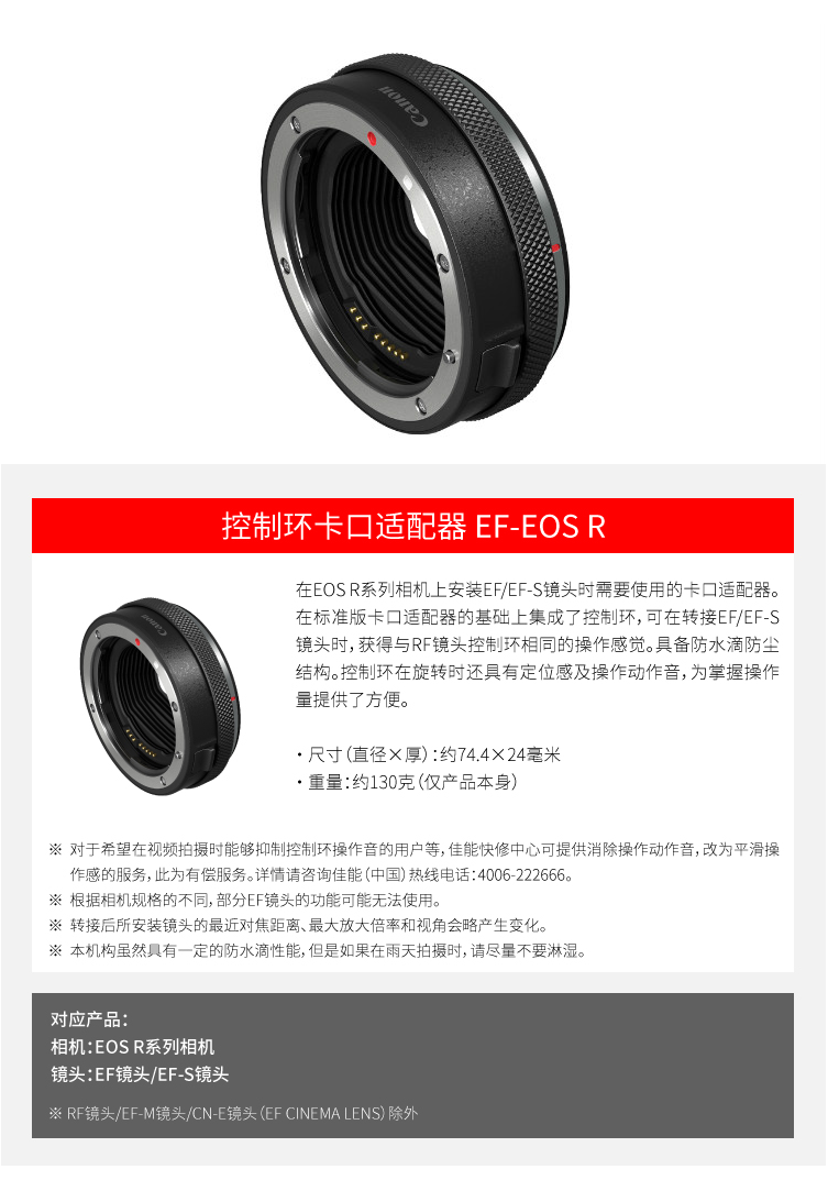 - 商品名稱:佳能(Canon)控制環(huán)卡口適配器EF-EOSR 適用于鏡頭RF24-105mm F4 L IS USM