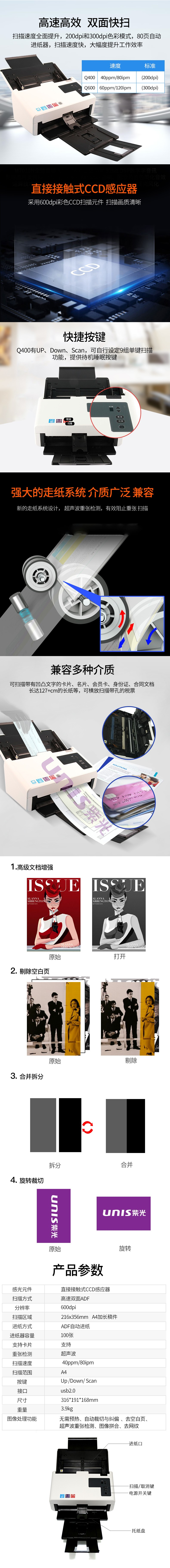 • 商品名稱:紫光(UNIS)Q400掃描儀 A4高速雙面自動(dòng)進(jìn)紙饋紙式