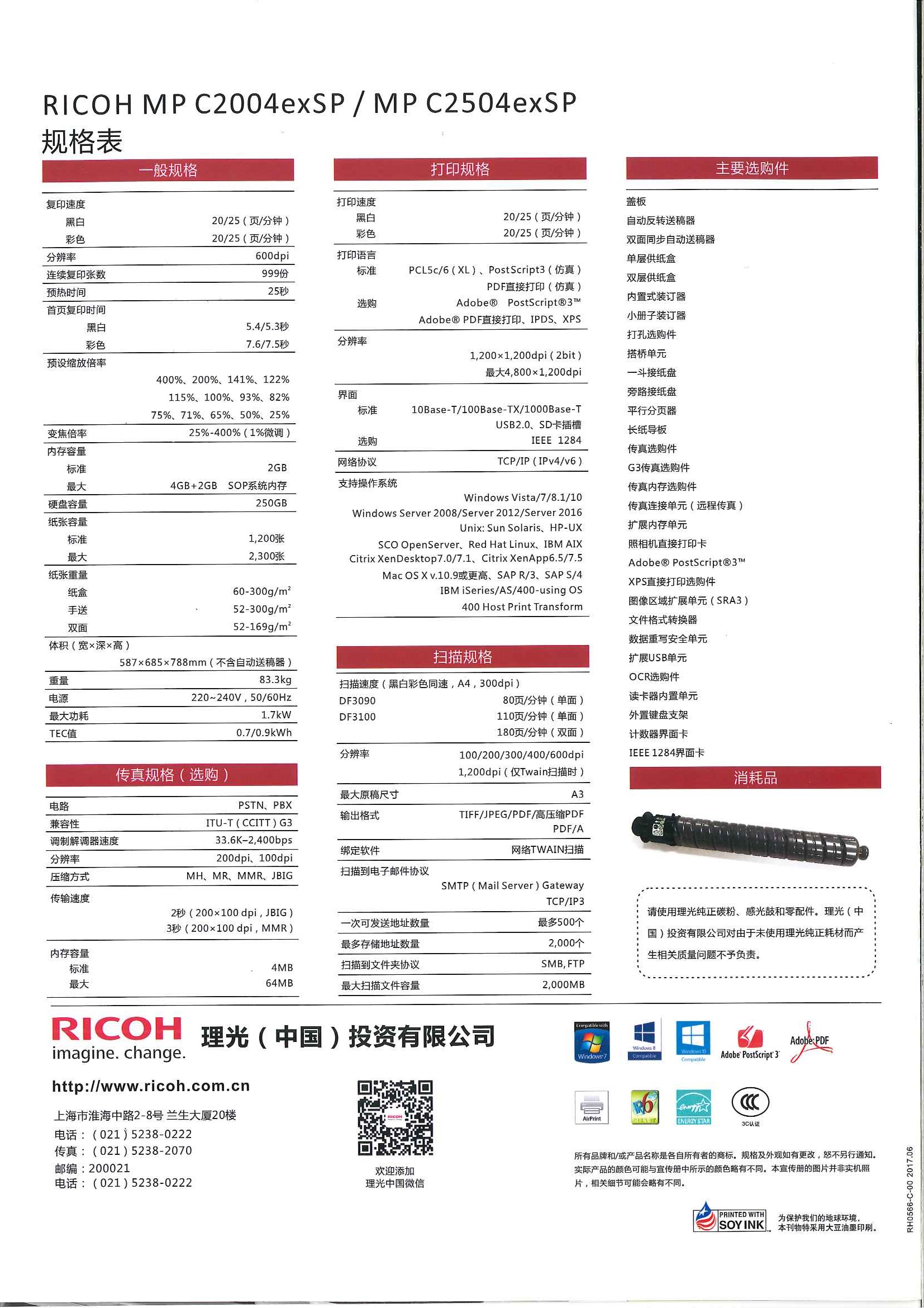 • 商品名稱:理光(Ricoh)A3彩色數(shù)碼復(fù)合機(jī)MPC2004EXSP(主機(jī)+送稿器+工作臺(tái)+刷卡輸出管理系統(tǒng))