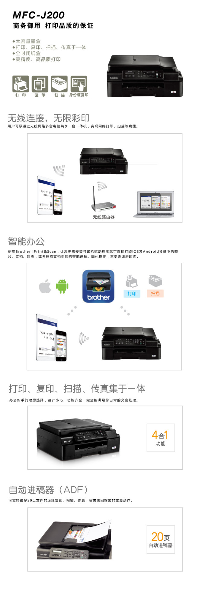 • 商品名稱:兄弟(brother) MFC-J200 A4彩色噴墨多功能一體機(jī)(1200×6000dpi) 打印/復(fù)印/掃描/傳真 黑白27頁/分鐘;彩色10頁/分鐘 支持無線網(wǎng)絡(luò)打印/手動(dòng)雙面 一年保修 適用耗材:LC549XL-BK/LC545XL-Y/LC545XL-C/LC545XL-M 墨盒