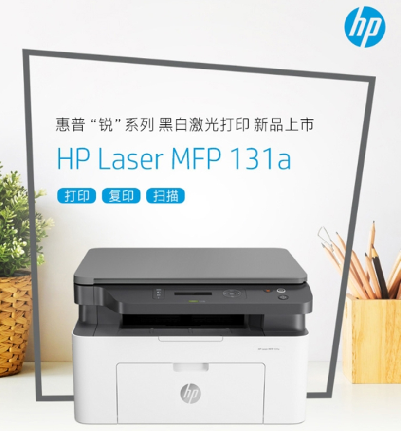 - 商品名稱:惠普(HP)A4黑白激光多功能一體機Laser MFP 131a 打印/復印/掃描 USB連接打印 手動雙面 20ppm 分辨率1200×1200dpi 適用耗材:W1003AC 鼓粉一體一年送修