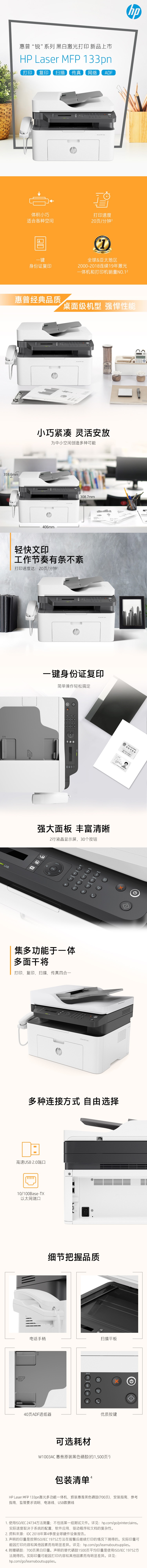 惠普(HP)A4黑白激光多功能一體機Laser MFP 133pn 打印 復印 掃描 傳真 送稿器 USB打印 20ppm 分辨率1200×1200dpi 適用耗材:W1003AC 鼓粉一體一年送修