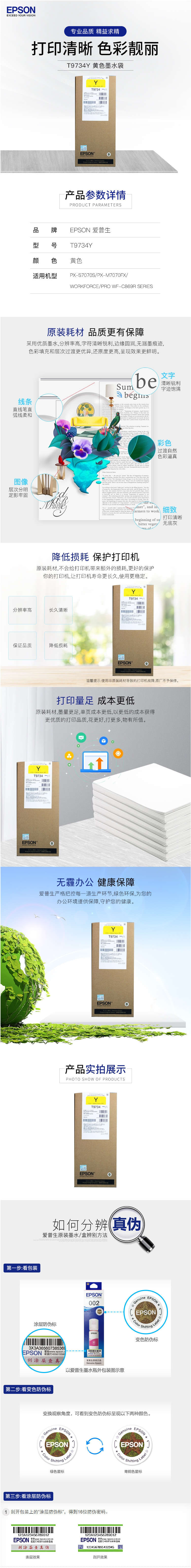 • 商品名稱:愛普生(Epson)T9734Y 原裝黃色墨水袋 適用PX-S7070S/PX-M7070FX/WF-C869R機(jī)型 約22000頁