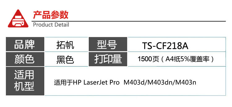 • 商品名稱:拓帆 TS-CF218A 粉盒帶芯片 1500頁 適用于M403d/M403dn/M403n/M132A