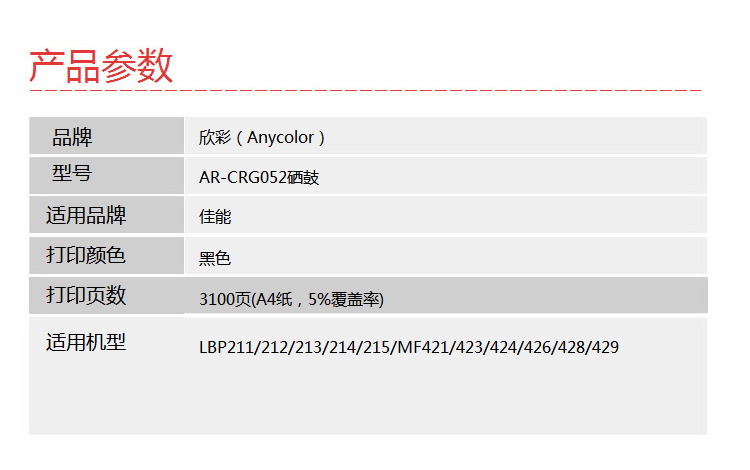 • 商品名稱:欣彩(Anycolor)CRG 052硒鼓(專業(yè)版)AR-CRG052 黑色 適用佳能 LBP211 212 213 214 215 MF421 423 424 426(激光/一體機)打印量3100頁
