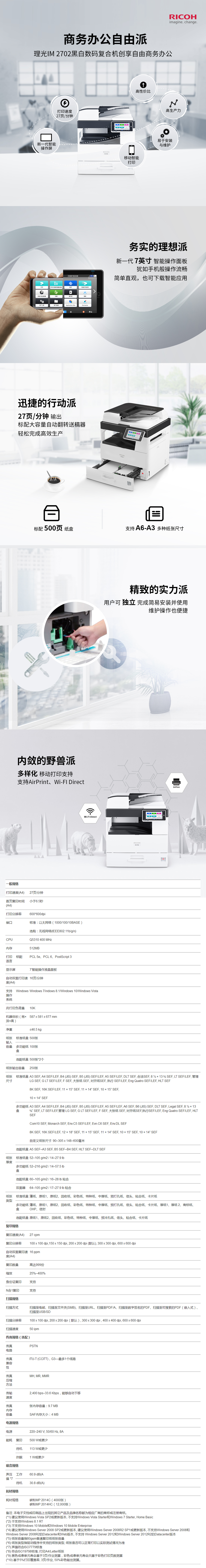 - 商品名稱:理光(Ricoh)M 2702 A3黑白數(shù)碼復(fù)合機(jī)(主機(jī)+送稿器+雙紙盒+工作臺(tái))