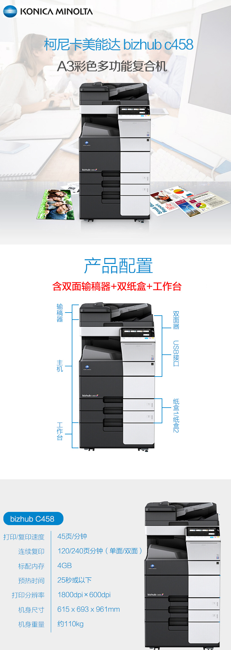 - 商品名稱:柯尼卡美能達(KONICA MINOLTA) bizhub C458(DF) A3彩色復(fù)合機 45頁/分 打印復(fù)印掃描 含輸稿器
