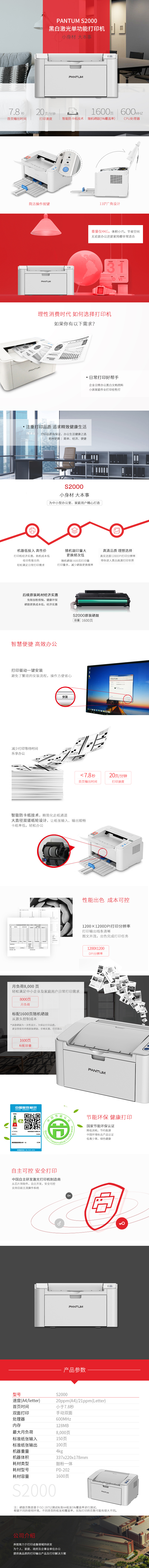 • 商品名稱:奔圖(PANTUM)S2000 A4黑白激光打印機