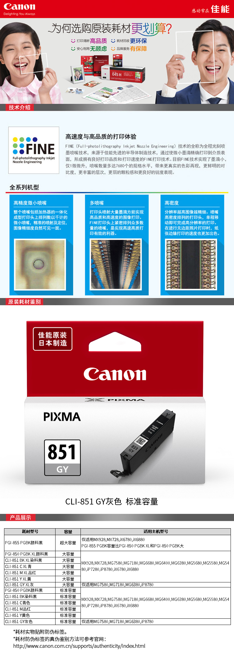 佳能(Canon) CLI-851 GY 灰色墨盒 打印量780頁 適用于MG7580、MG7180、MG6380、iP8780