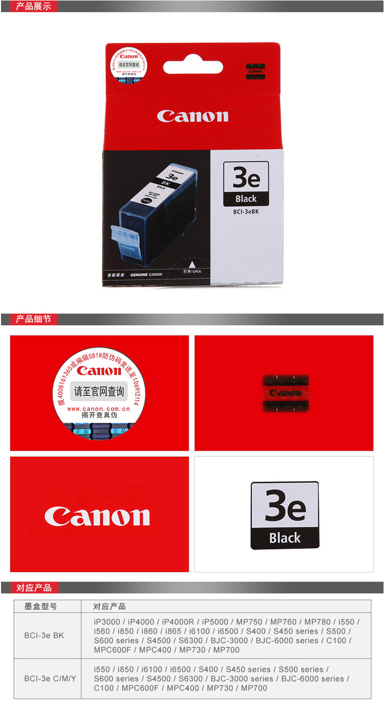 • 商品名稱:佳能(Canon) InkTank BCI-3e BK 黑色墨盒 適用于i6500/i6100 MP730