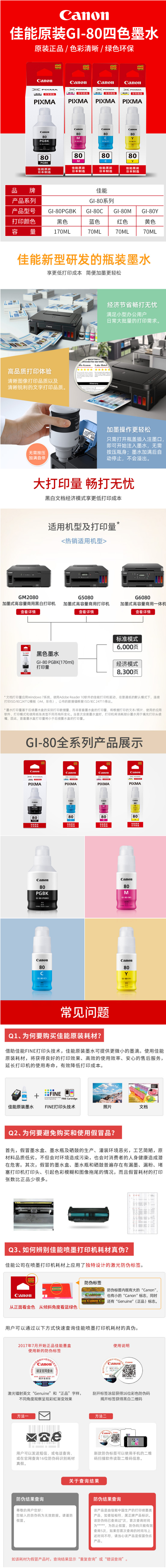 - 商品名稱:佳能(Canon) GI-80 Y 黃色墨水瓶 打印量7700頁 適用于G6080、G7080、GM4080、G5080、GM2080,注:GM2080和GM4080只適用于GI-80 PGBK