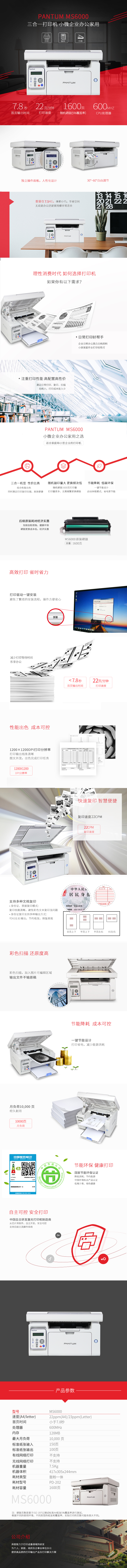 奔圖(PANTUM)A4黑白激光多功能一體機(jī) MS6000 打印/復(fù)印/掃描 手動雙面 不支持網(wǎng)絡(luò)打印 打印速度22ppm 分辨率1200×1200dpi