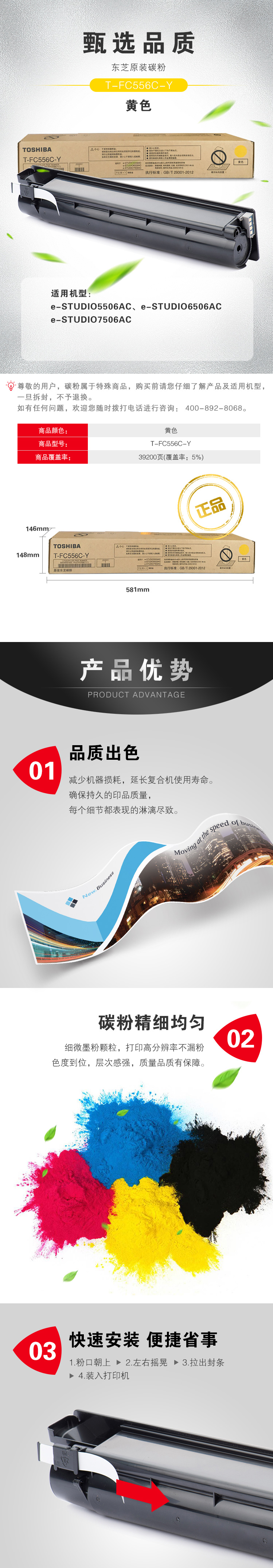 東芝(TOSHIBA)T-FC556C-Y原裝碳粉 黃色 打印量39200頁 適用于e-STUDIO5506AC/6506AC/7506AC