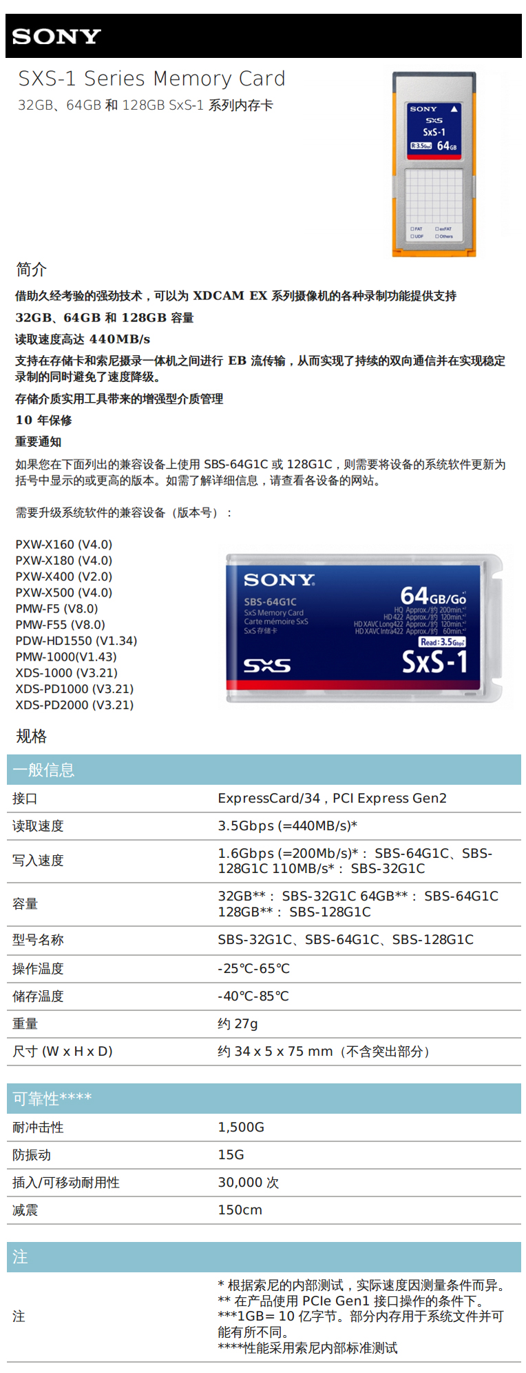 • 商品名稱:索尼(SONY)SXS卡 SXS-1 64G專業(yè)攝像機存儲卡
