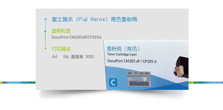 • 商品名稱:富士施樂(FujiXerox)CP305d,CM305df藍色墨粉筒,粉盒,碳粉 打印量約3000頁 適用于DocuPrint CM305df/CP305d