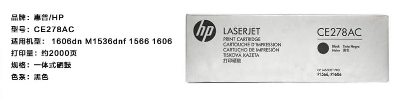 • 商品名稱:惠普(HP) CE278AC 黑色原裝硒鼓 打印量約2000頁 適用1606dn/M1536dnf/1566/1606