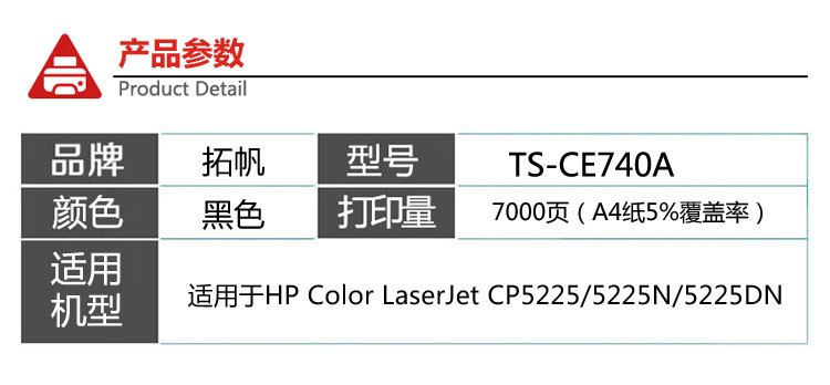 • 商品名稱:拓帆 TS-CE740A黑色硒鼓 打印量7000頁 適用于HP CP5225
