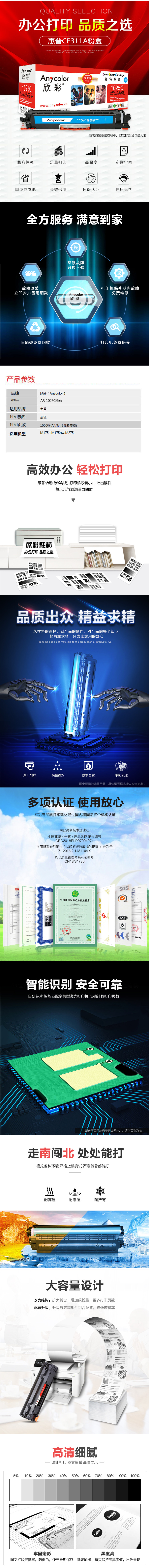 欣彩(Anycolor)AR-1025C 藍(lán)色粉盒 CE311A 打印量約1000頁 適用于惠普HP CP10251025NW MFP M175A M175NW M275