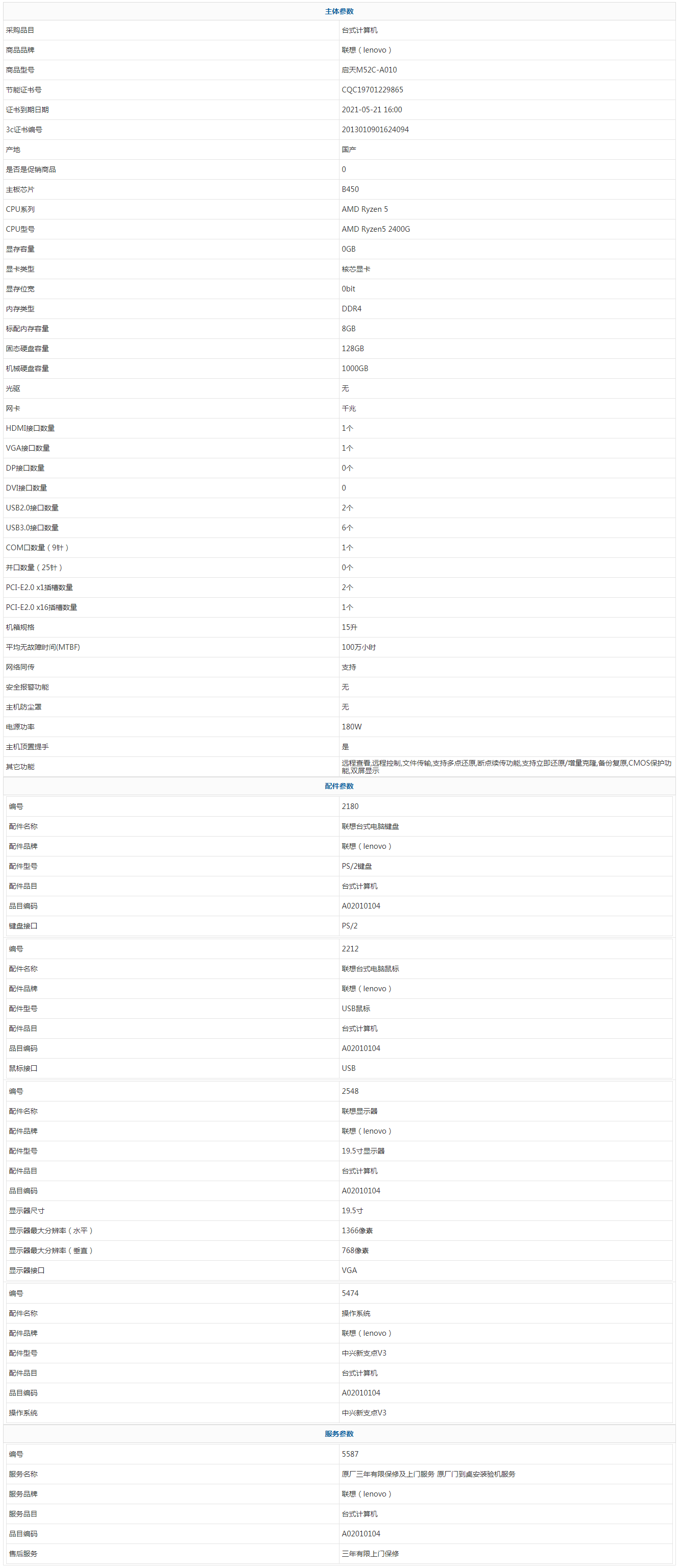 聯(lián)想(lenovo) 啟天M52C-A010 AMD Ryzen 5 AMD Ryzen5 2400G 8GB 1000GB 128GB 中興新支點(diǎn)V3 19.5寸 三年有限上門保修