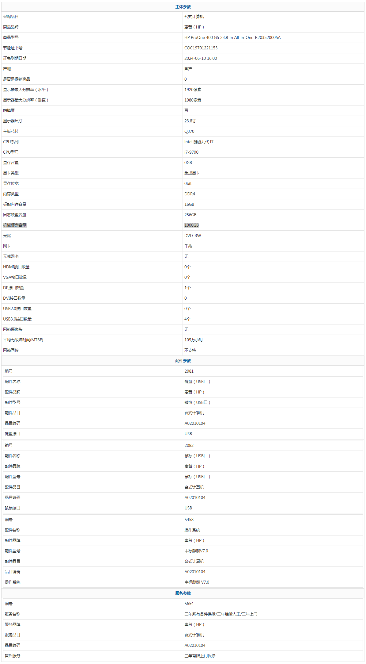 - 商品名稱:惠普(HP) HP ProOne 400 G5 23.8-in All-in-One-R203520005A intel 酷睿九代 i7 i7-9700 16GB 1000GB 256GB 中標(biāo)麒麟 V7.0 23.8寸 三年有限上門保修
