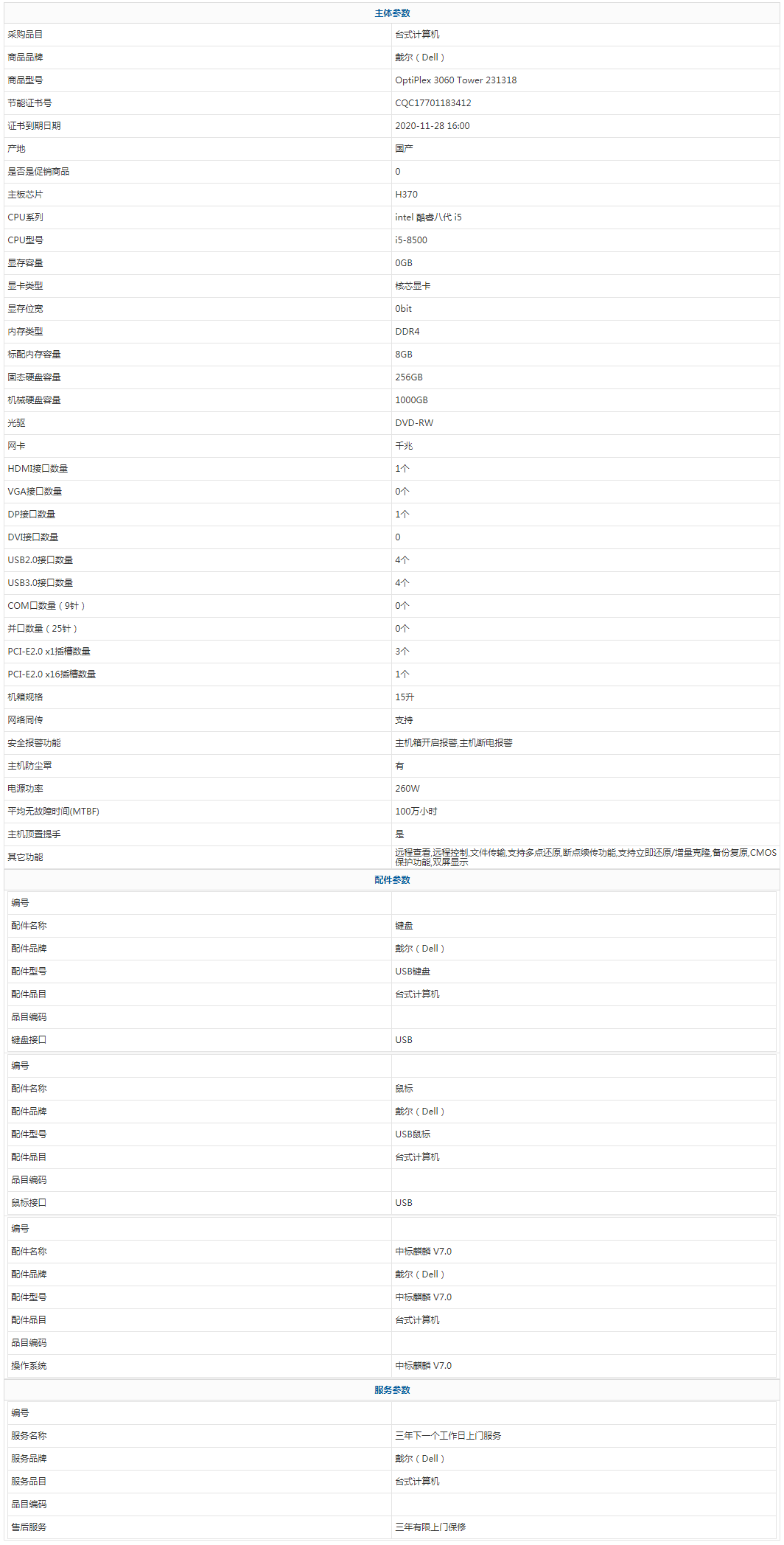 - 商品名稱:戴爾(Dell) OptiPlex 3060 Tower 231318 intel 酷睿八代 i5 i5-8500 8GB 1000GB 256GB 中標(biāo)麒麟 V7.0 三年有限上門(mén)保修