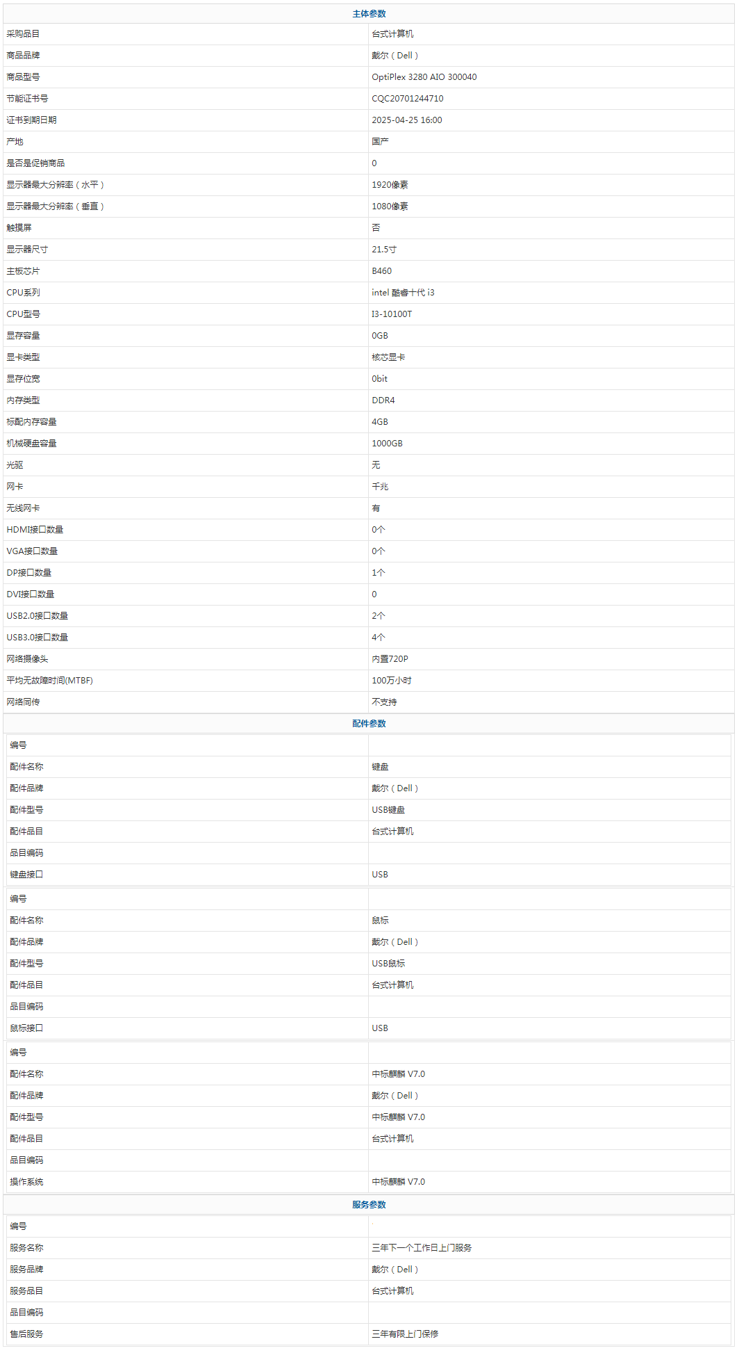 - 商品名稱:戴爾(Dell) OptiPlex 3280 AIO 300040 intel 酷睿十代 i3 I3-10100T 4GB 1000GB 中標(biāo)麒麟 V7.0 21.5寸 三年有限上門保修