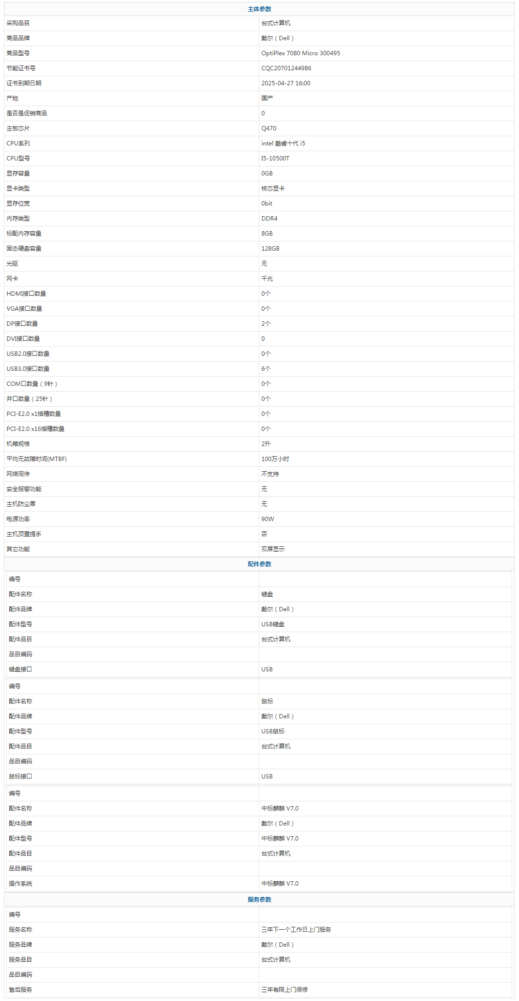 - 商品名稱:戴爾(Dell) OptiPlex 7080 Micro 300495 intel 酷睿十代 i5 I5-10500T 8GB 128GB 中標(biāo)麒麟 V7.0 三年有限上門保修