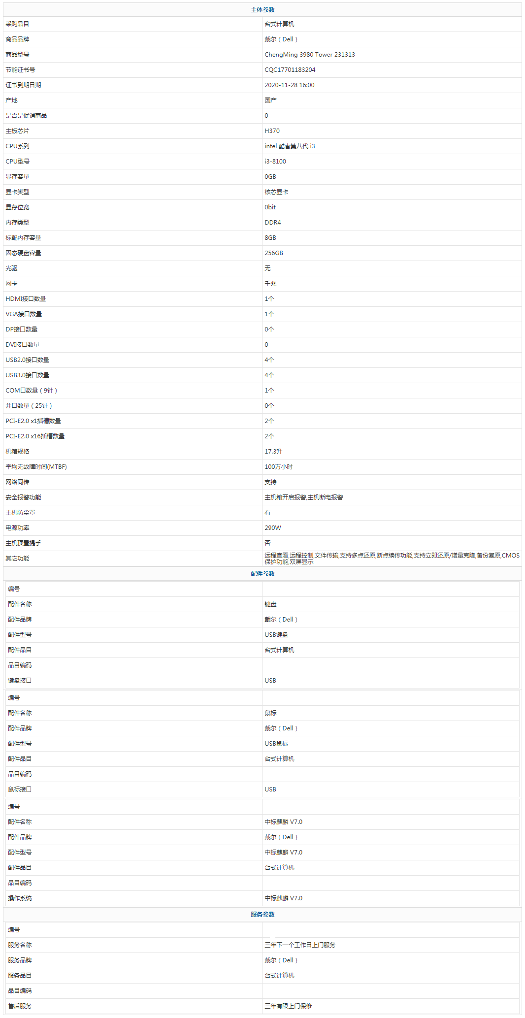 • 商品名稱:戴爾(Dell) ChengMing 3980 Tower 231313 intel 酷睿第八代 i3 i3-8100 8GB 256GB 中標(biāo)麒麟 V7.0 三年有限上門保修