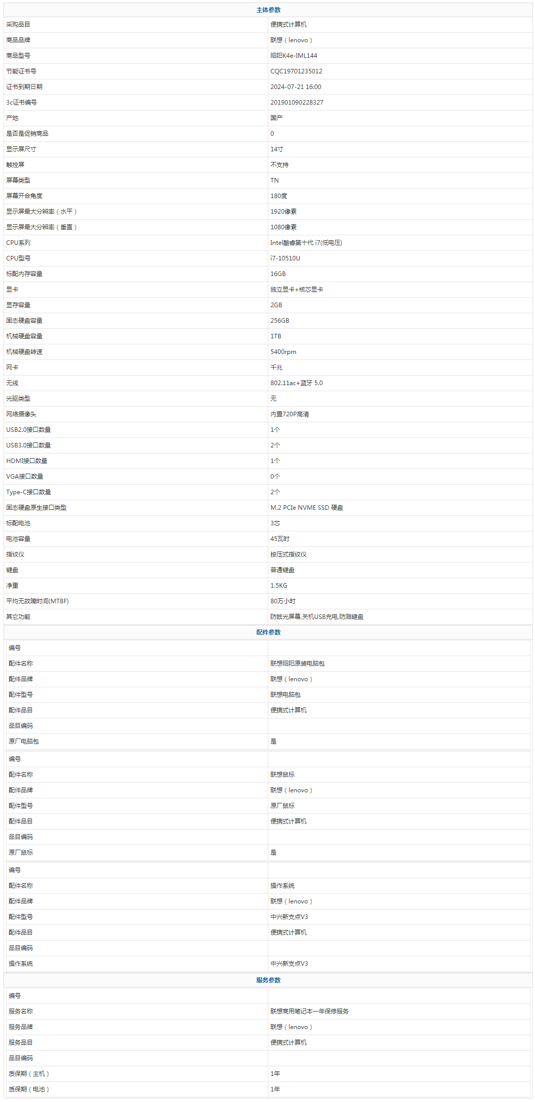 - 商品名稱:聯(lián)想(lenovo) 昭陽K4e-IML144 Intel酷睿第十代 i7(低電壓) i7-10510U 16GB 1TB 256GB 中興新支點(diǎn)V3 14寸 1年
