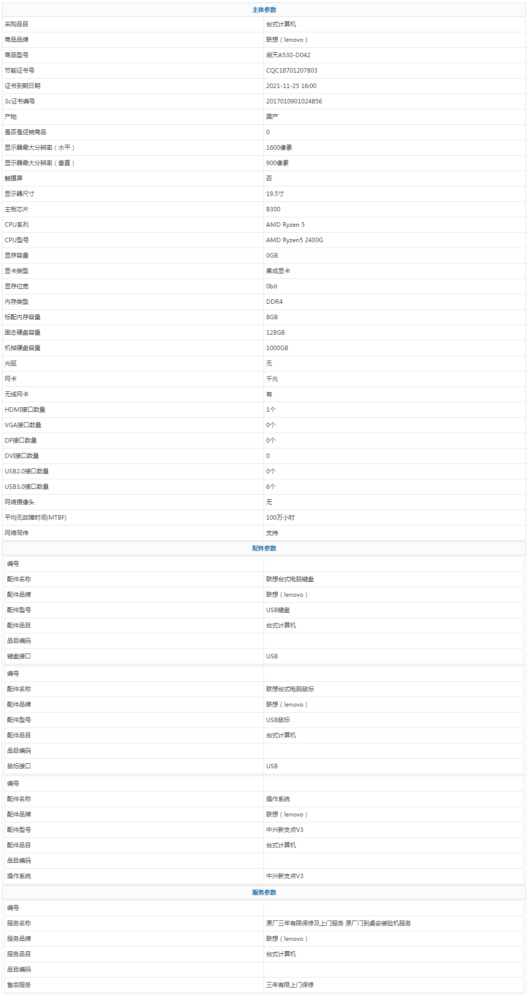 聯(lián)想(lenovo) 啟天A530-D042 AMD Ryzen 5 AMD Ryzen5 2400G 8GB 1000GB 128GB 中興新支點(diǎn)V3 19.5寸 三年有限上門保修