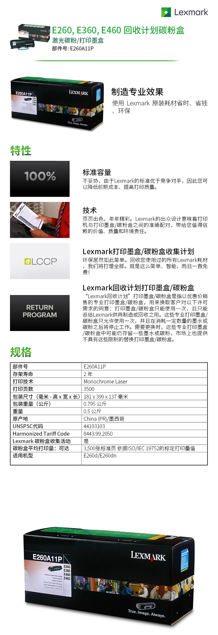 • 商品名稱:利盟(Lexmark)E260A11P 黑色墨粉盒 約3500頁打印量 適用于激光打印機利盟 E260d/dn/E360d/dn/E460dn