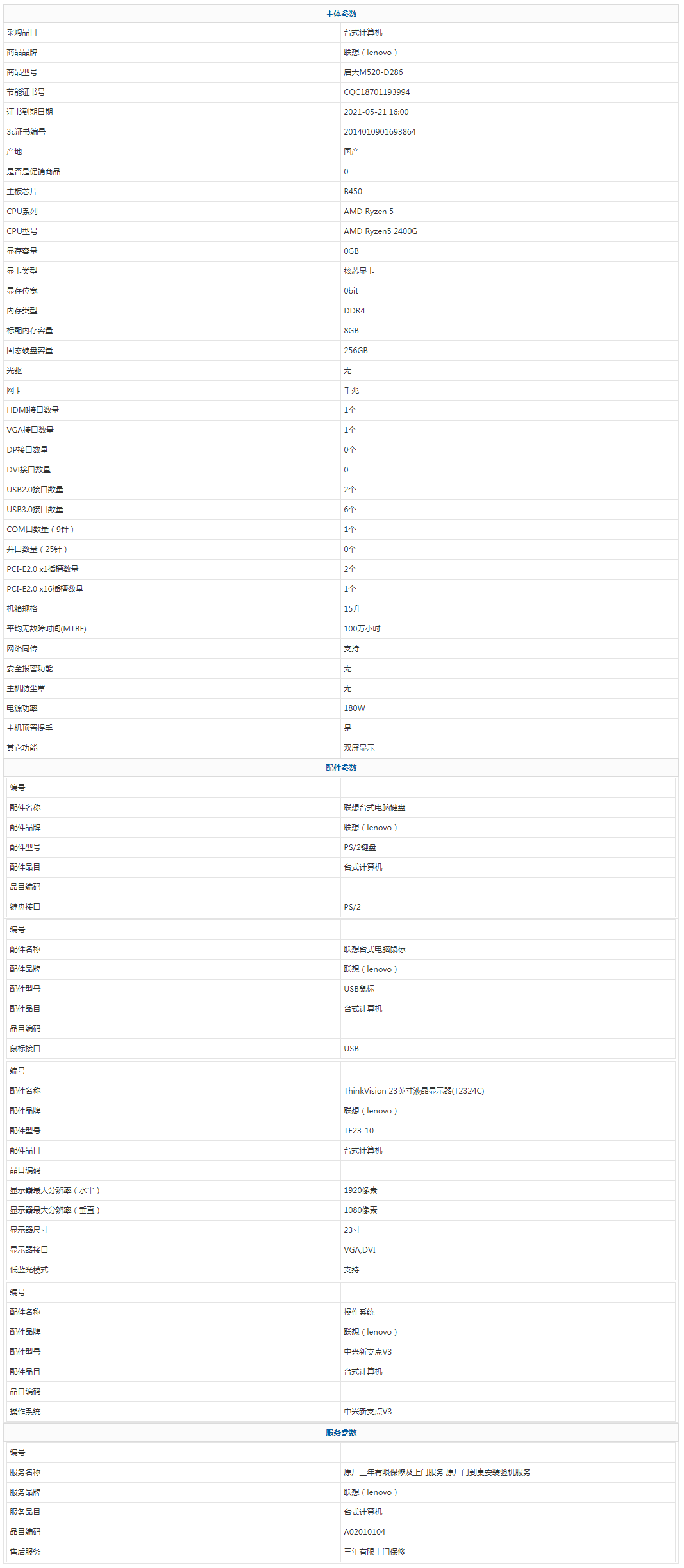 - 商品名稱:聯(lián)想(lenovo) 啟天M520-D286 AMD Ryzen 5 AMD Ryzen5 2400G 8GB 256GB 中興新支點(diǎn)V3 23寸 三年有限上門保修