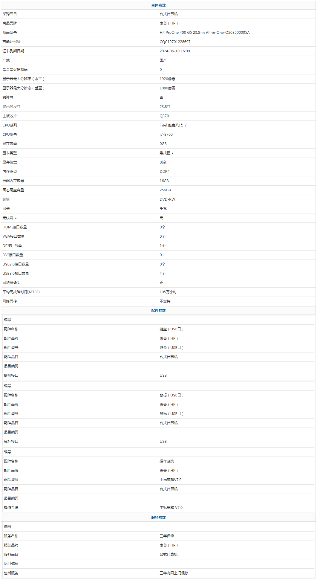 - 商品名稱:惠普(HP) HP ProOne 400 G5 23.8-in All-in-One-O203500005A intel 酷睿八代 i7 i7-8700 16GB 256GB 中標(biāo)麒麟 V7.0 23.8寸 三年有限上門保修