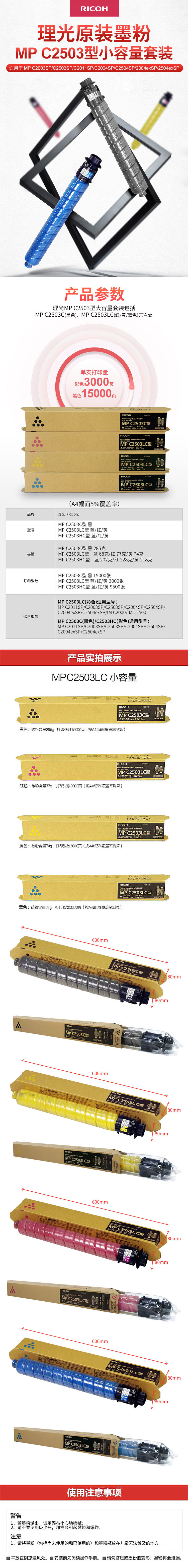 - 商品名稱:理光(Ricoh)MP C2503C 碳粉小容四色套裝(黑/紅/藍/黃)適用于MP C2003SP/C2503SP/C2011SP/C2004SP/C2504SP