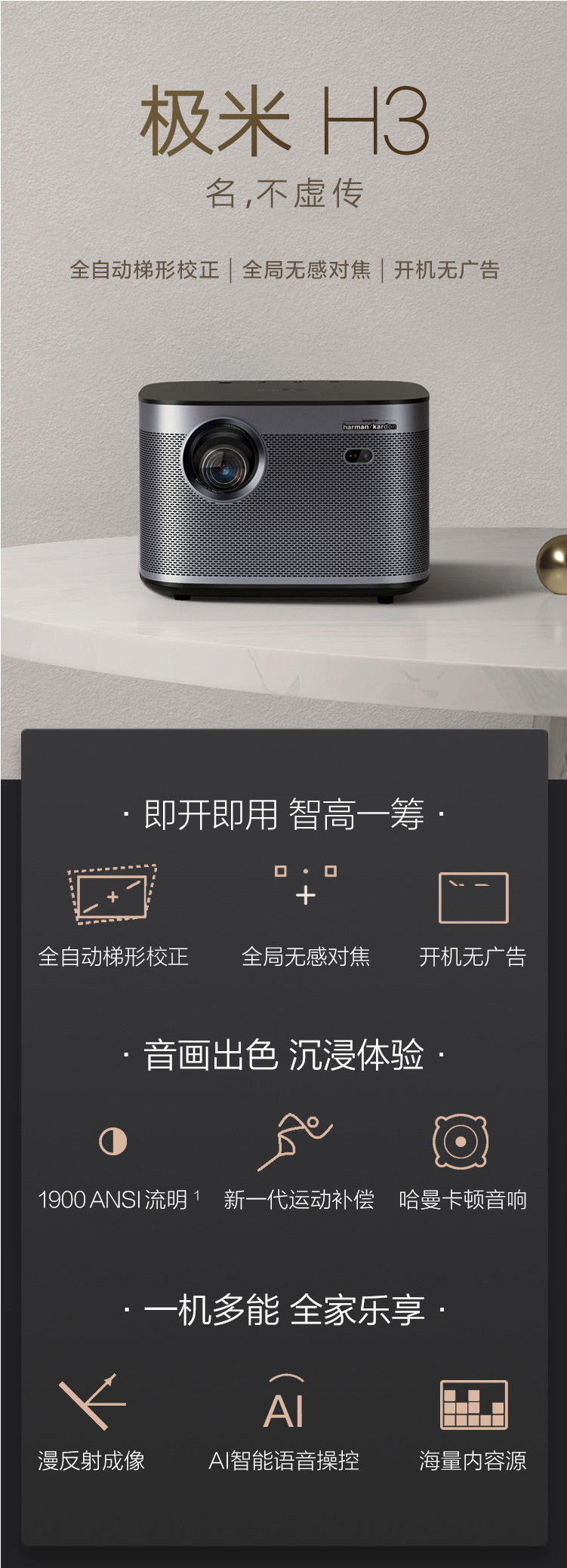 • 商品名稱:極米(XGIMI)H3投影儀 1900流明 1080全高清 全自動梯形校正 全局無感對焦 對比度1000:1