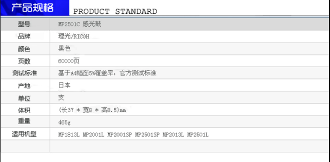 • 商品名稱:理光(RICOH) MP 2501C 黑色套鼓 約60000頁 適用于MP 2001SP/2501L/2501SP/2013L/2001L/1813L