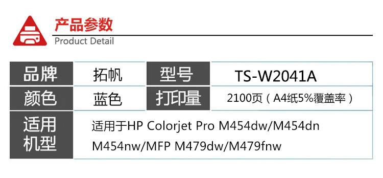 • 商品名稱:拓帆 TS-W2041A 藍色硒鼓 打印量約2100頁 適用HP M454dw/m454dn/m454nw/m479dw/479fnw