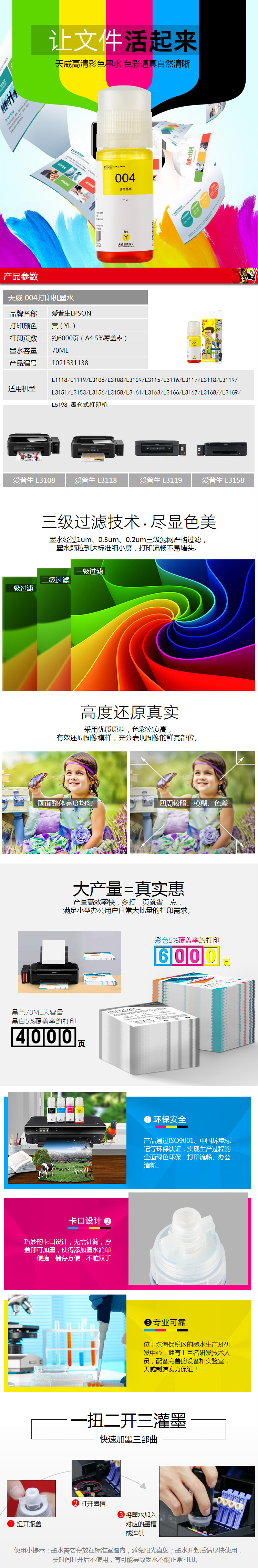 • 商品名稱:天威 004墨水 黃色 70ml 約6000頁 適用愛普生EPSON L119 1118 3153 3151 3168 3166 3115墨倉式打印機(jī)