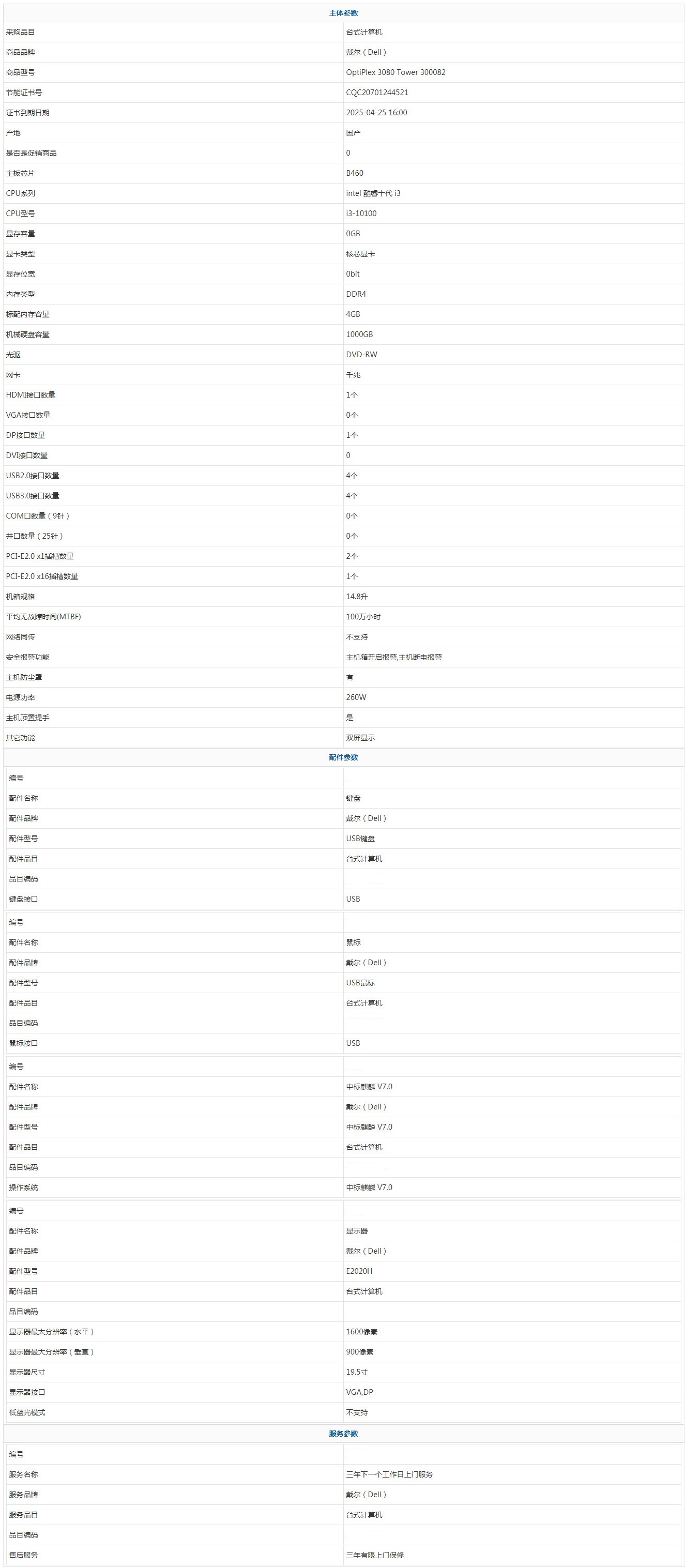 - 商品名稱:戴爾(Dell) OptiPlex 3080 Tower 300082 intel 酷睿十代 i3 i3-10100 4GB 1000GB 中標(biāo)麒麟 V7.0 19.5寸 三年有限上門保修