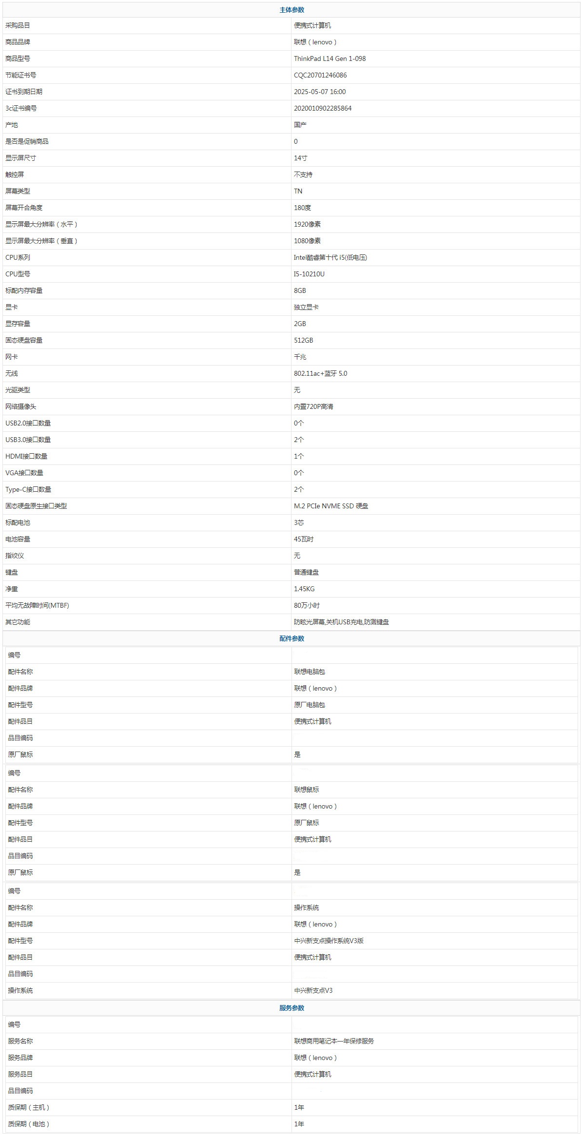 - 商品名稱:聯(lián)想(lenovo) ThinkPad L14 Gen 1-098 Intel酷睿第十代 i5(低電壓) I5-10210U 8GB 512GB 中興新支點(diǎn)V3 14寸 1年