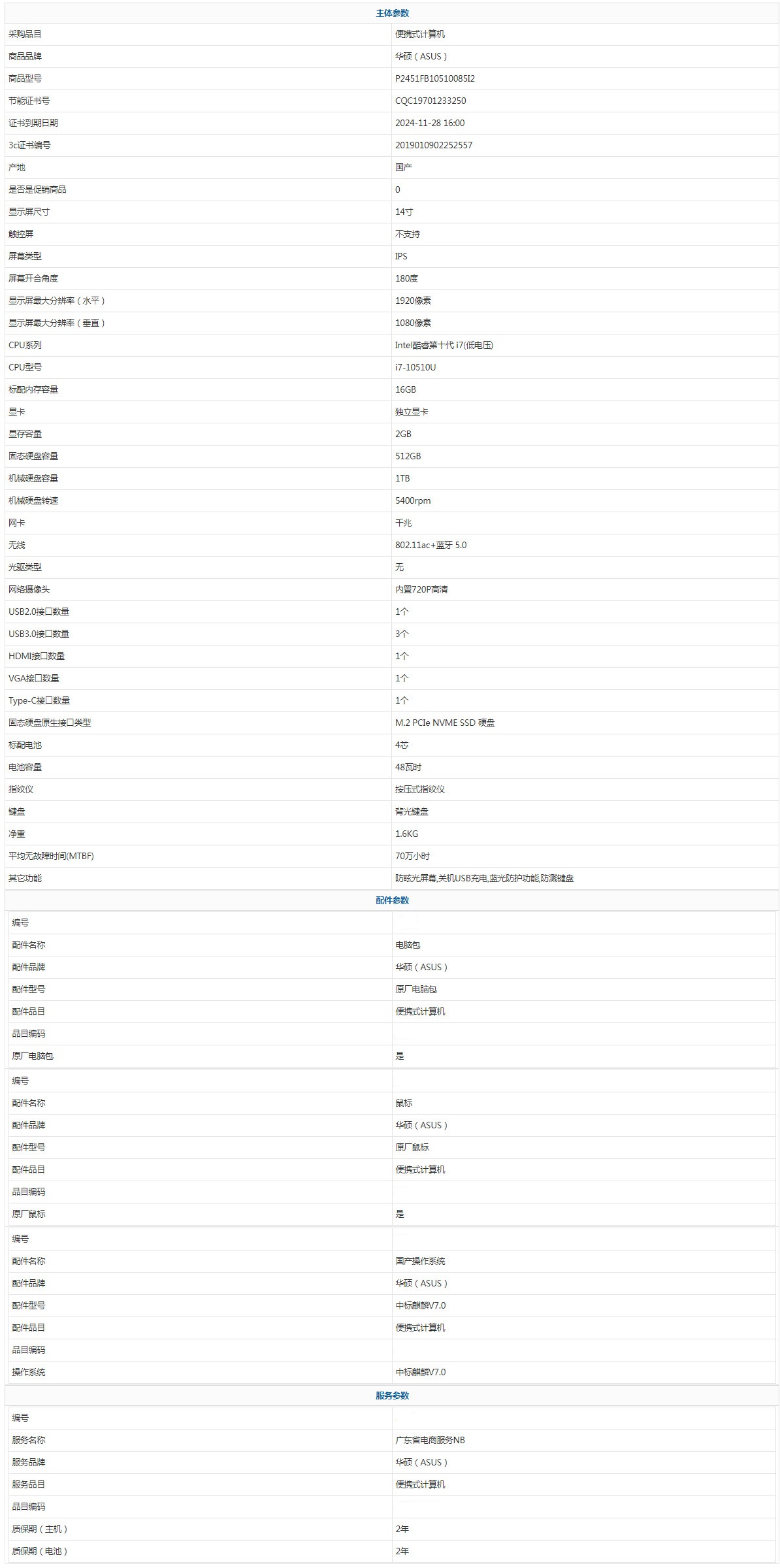 華碩(ASUS) P2451FB10510085I2 Intel酷睿第十代 i7(低電壓) i7-10510U 16GB 1TB 512GB 中標(biāo)麒麟V7.0 14寸 2年